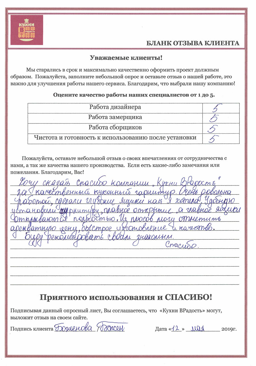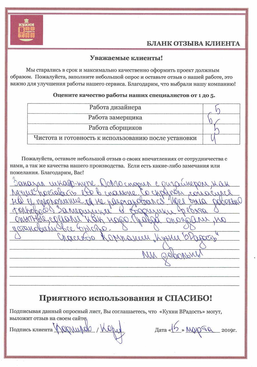 При заказе вы должны самостоятельно подобрать материал, из которого будет изготавливаться ваша мебель. Вам нужно выбрать материал именно качественный, но не дешевый. Ведь, вы же заказываете кухню не на один год, и если она будет изготовлена из некачественного дешевого материала, она прослужит вам совсем недолго и будет совсем небезопасна для эксплуатации.